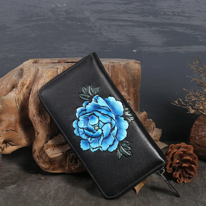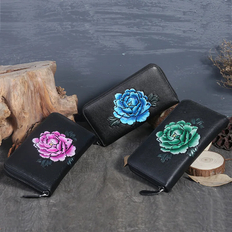 Free shipping New Baotou leather peony embossed leather clutch large capacity ladies long clutch bag